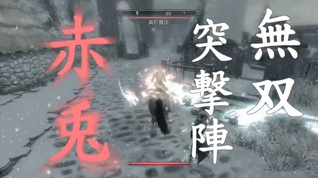| 無双突撃陣 | りょ、呂布だー! | この頃のSkyrimはまだ騎乗攻撃が実装されていないバージョンで、MODが必要でした。 しかし、MODなんか無くたって、騎乗戦闘はできる!という意気込みで作りました。 ちなみに、私がプレイしたことある無双は、三国無双3、4、無双OROCHIのみです。 |