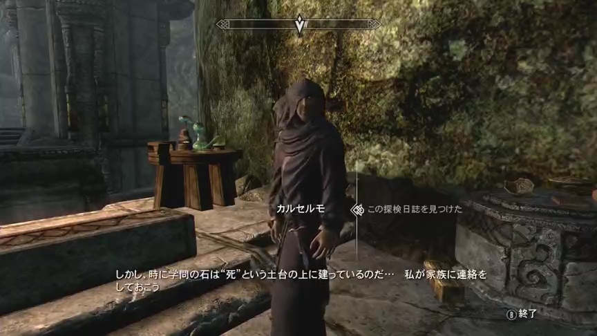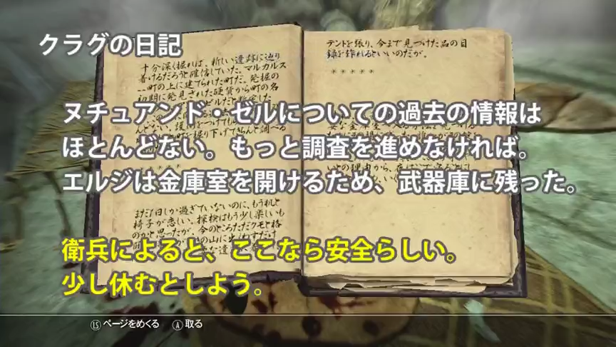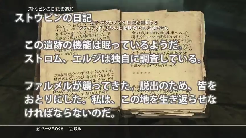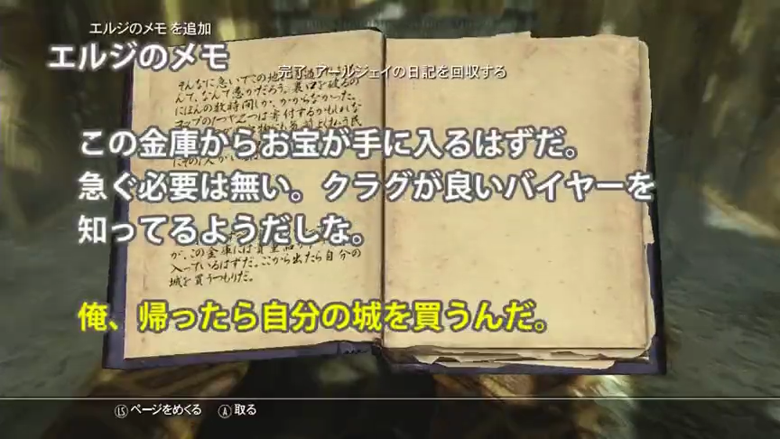 | 調査隊の探索2 | 死亡フラグ続々 | 日記や本を開く際は適当に内容をまとめています。でも、エルジの「帰ったら自分の城を買う」はちゃんと本に書いてある、ベセスダ公式死亡フラグとなっております。 |