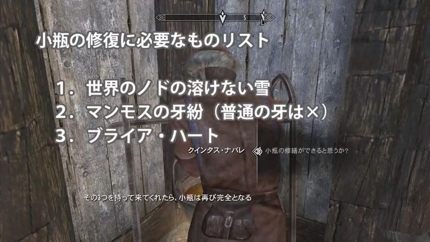 会いに行ってみると、修復には「世界のノドの魔法の雪」、「マンモスの牙粉」、「ブライア・ハート」が必要と言われます。