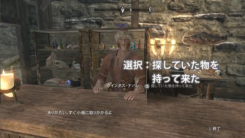 | 講和の使者に足る資格 | クインタス迷訳 | 訳は別に間違ってないのに、シチュエーション的におかしなことになる小瓶の修理。 ぶっちゃけ白き小瓶の効果は微々たる物なんですが、まあスカイリムの名場面の一つとしてチョイスしておきました。 |