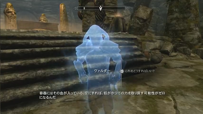 ヴァルダーが言うには、遺跡の中にある容器(クエストでは、誤訳で「船」となってます)を3つ集める必要があるとの事。